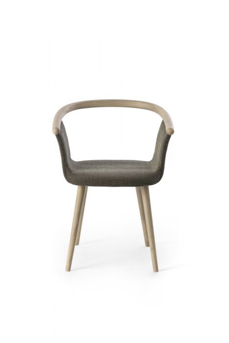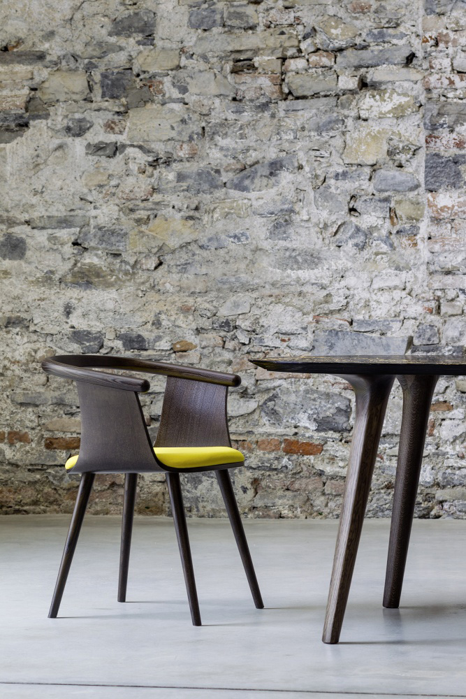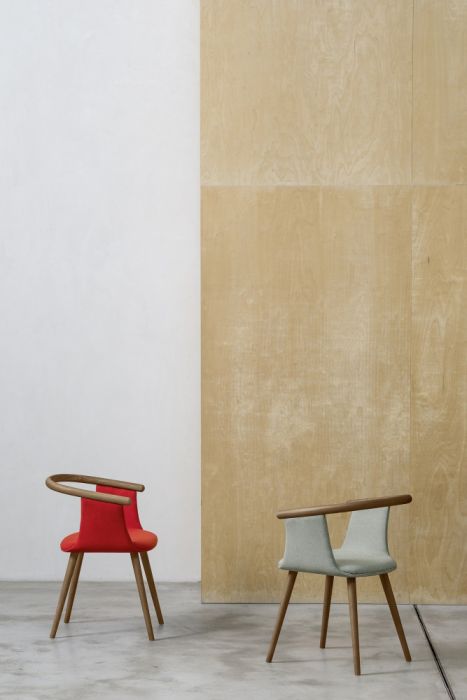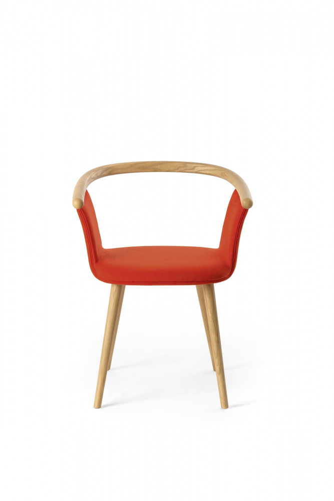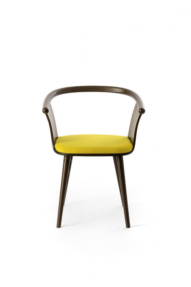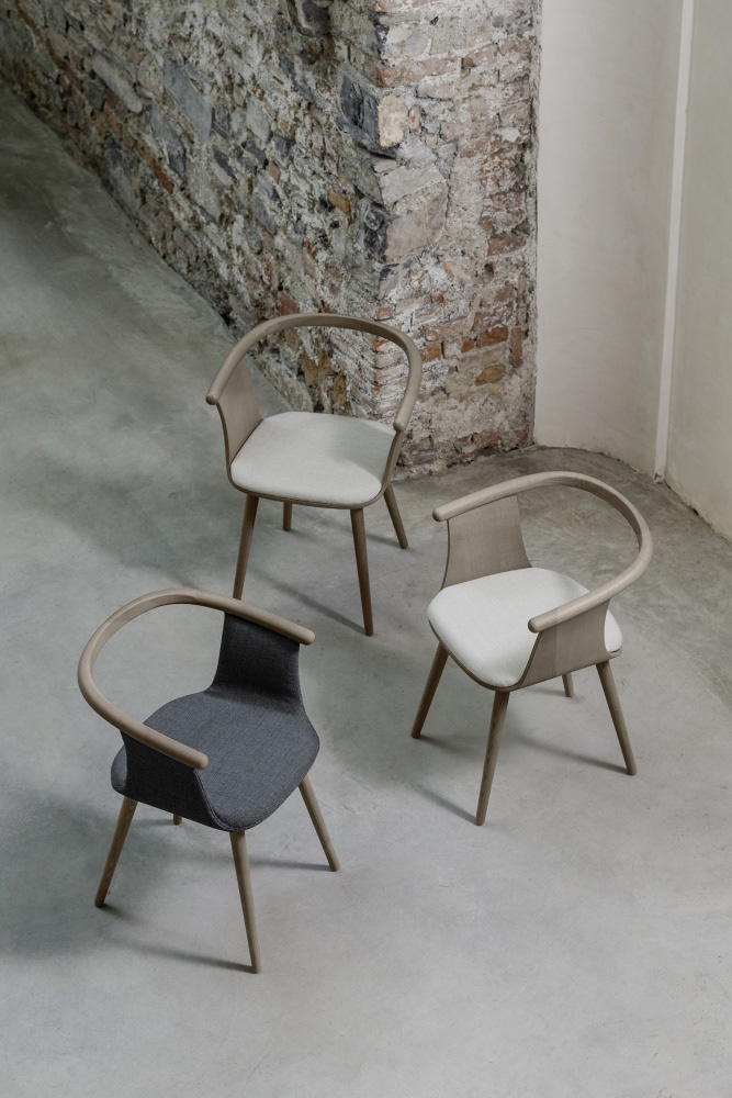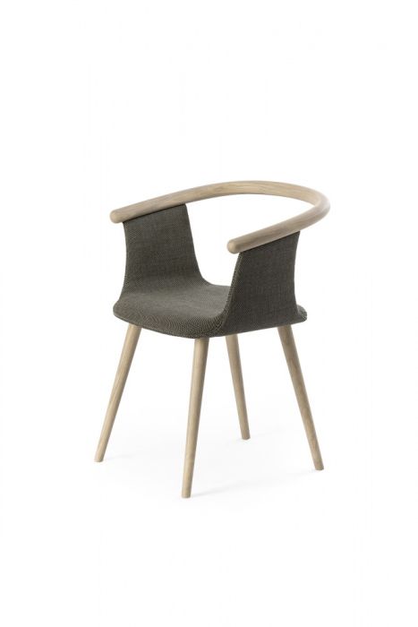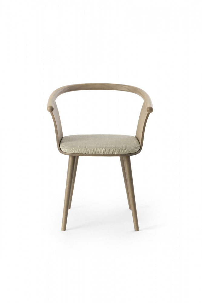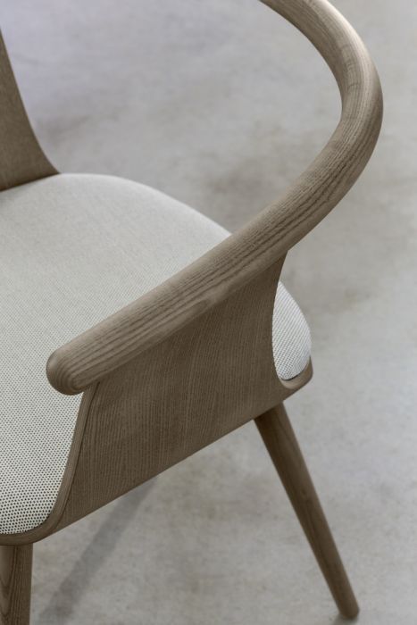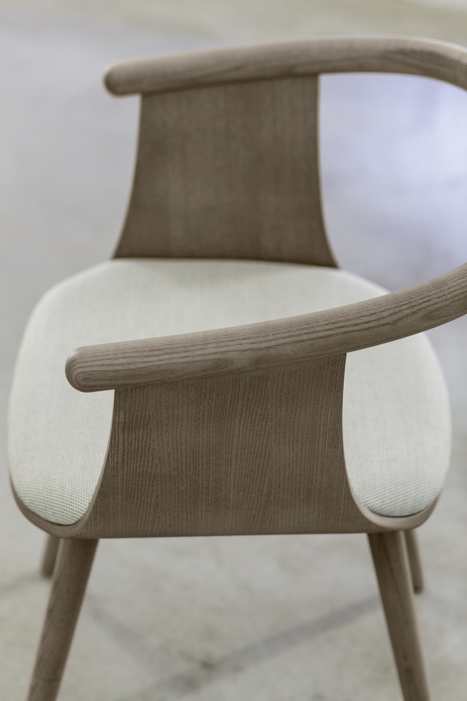 La struttura di Yuumi, in frassino, ha forme avvolgenti ed è caratterizzata da un elemento in legno curvato che funge al contempo da spalliera e braccioli, lavorato per accogliere in modo confortevole ed ergonomico la schiena.