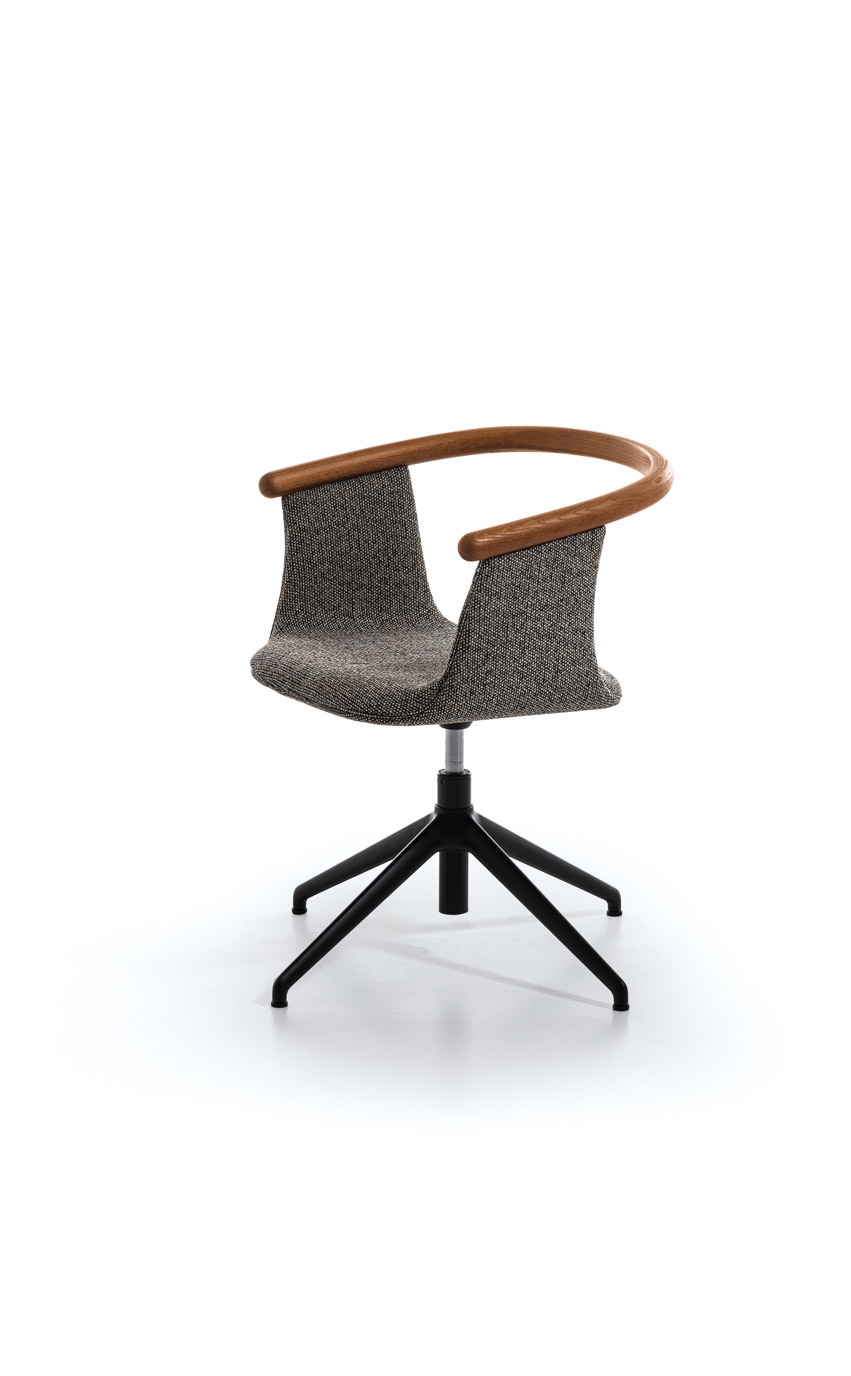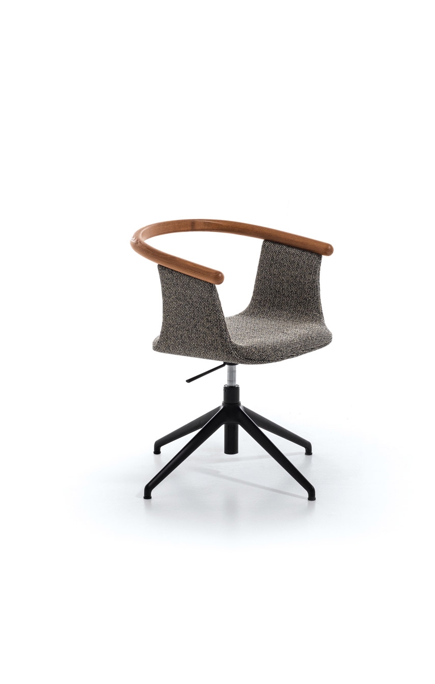 Poltroncina girevole con schienale in frassino, naturale, tinto o laccato opaco; scocca interamente rivestita.