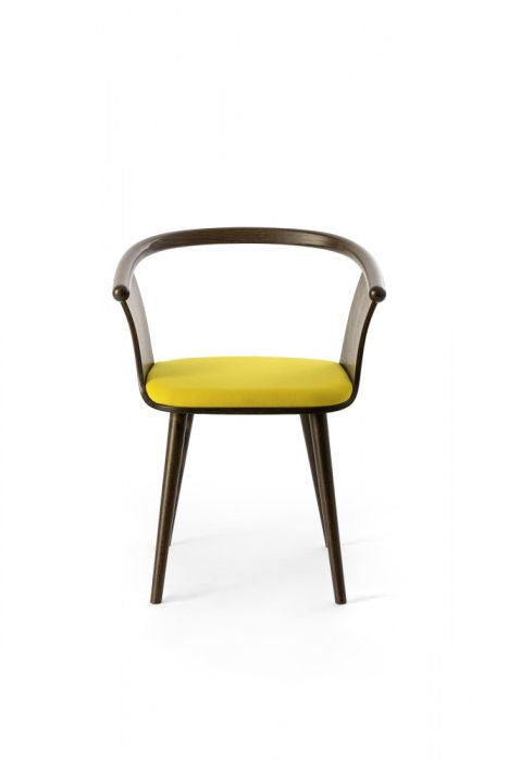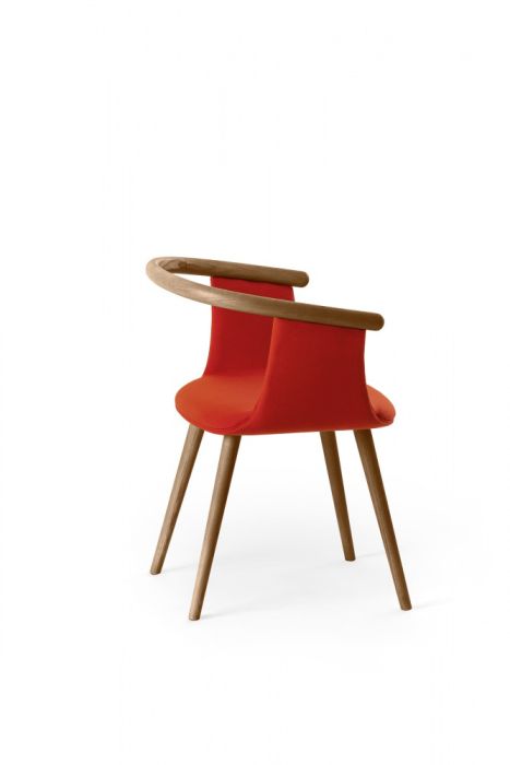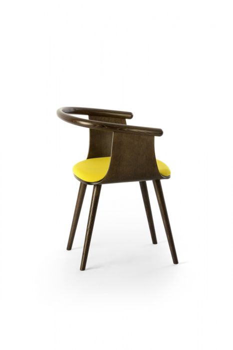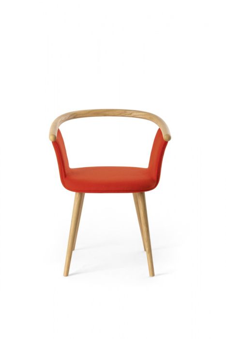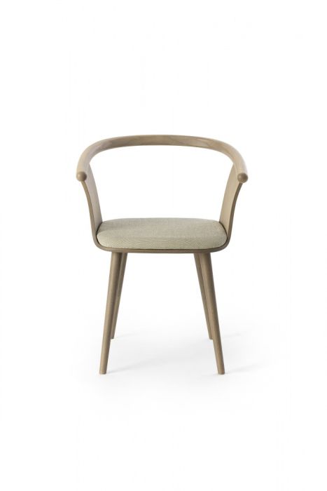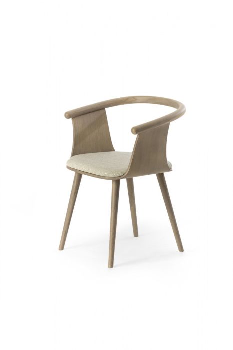 Poltroncina con struttura in frassino, naturale, tinto o laccato opaco; scocca in legno con sedile imbottito o completamente rivestita.