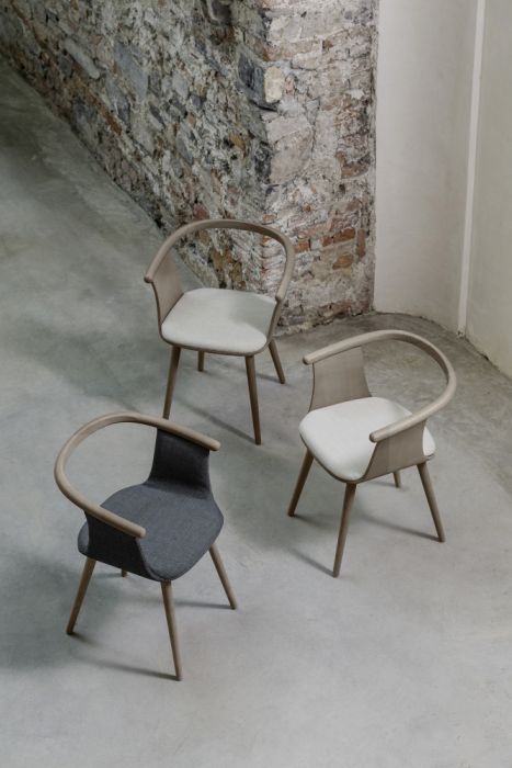 Yuumi, una poltroncina resa unica da dettagli pregiati e proposta con cuscino sulla seduta o completamente rivestita.